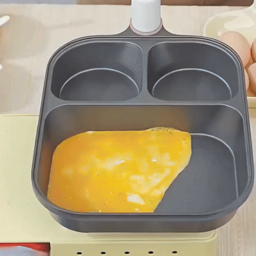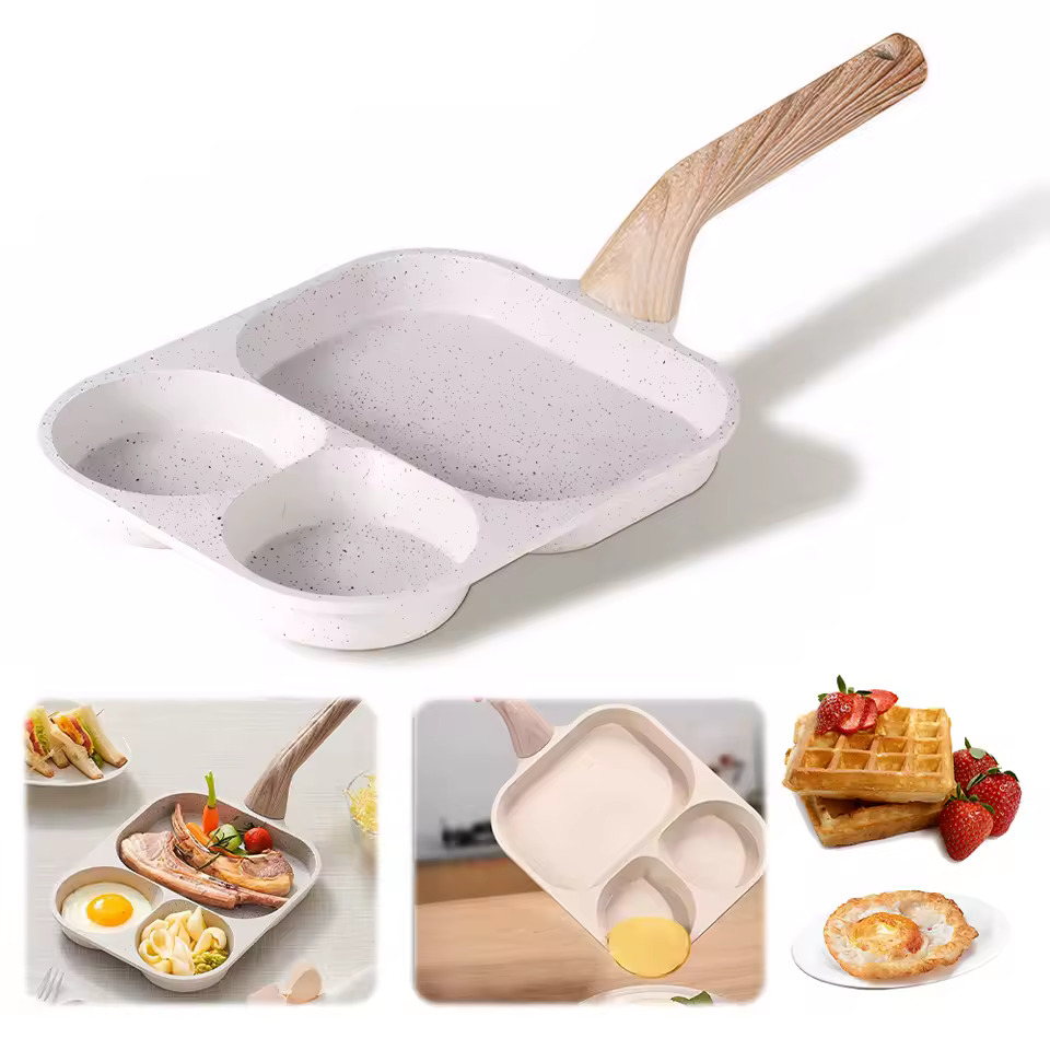 Med denne 3-i-1 non-stick-stekepannen kan du tilberede egg, biff, pannekaker og grønnsaker i én og samme panne. Den delte designen sparer tid, holder smakene adskilt og gjør den daglige matlagingen raskere og renere. Denne stekepannen er designet for travle kjøkken og små rom. Non-stick-belegget i granitt krever lite olje, varmer jevnt og kan tørkes av på få sekunder. Den fungerer på gass- og induksjonskomfyrer, noe som gjør den perfekt til daglig frokost og raske måltider.