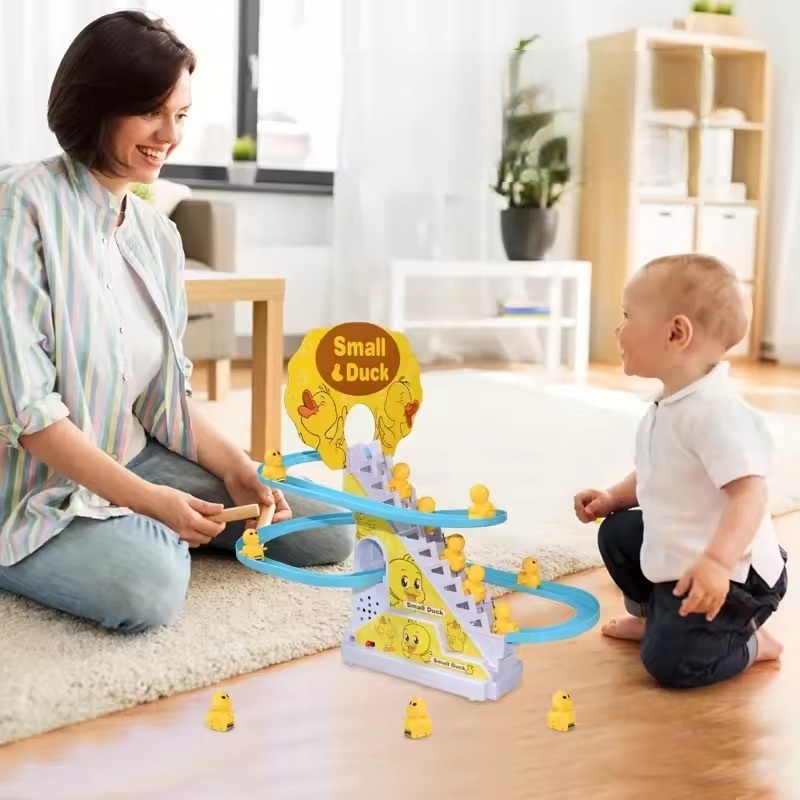 Leken med andesklie underholder barn med munter musikk og blinkende LED-lys. Se på når endene klatrer opp trappene og glir ned, noe som skaper endeløs moro. Det er en perfekt måte å skape glede og latter i leken på.