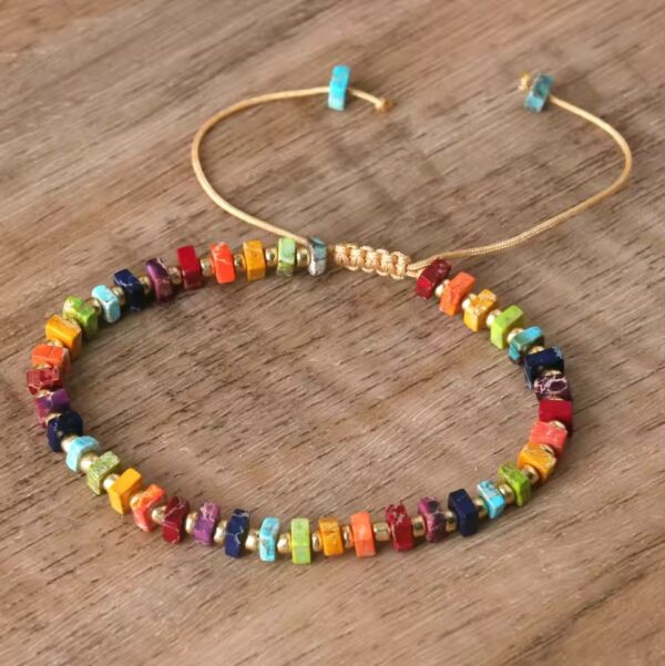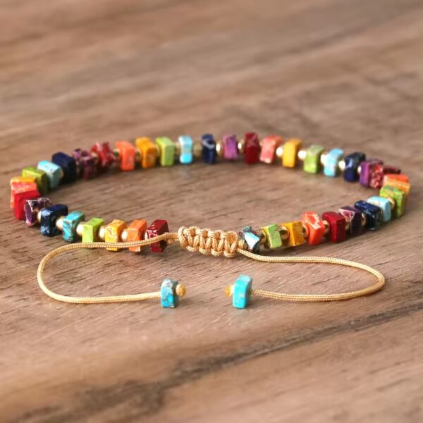 Armbåndet med chakrastein har en vakker firkantet form laget av naturlige keiserlige steiner. Hvert armbånd er håndlaget, noe som gir det en unik sjarm som utfyller ethvert antrekk. Det elegante designet passer perfekt til både uformelle og formelle anledninger.