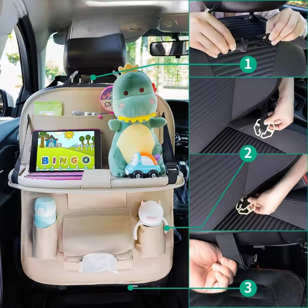 Denne førsteklasses bilorganisatoren i skinn forvandler baksetet til et ryddig og funksjonelt rom. Med flere oppbevaringslommer og et sammenleggbart brett er den perfekt for å holde alt – fra drikke og nettbrett til paraplyer – på plass mens du reiser komfortabelt og stilfullt.