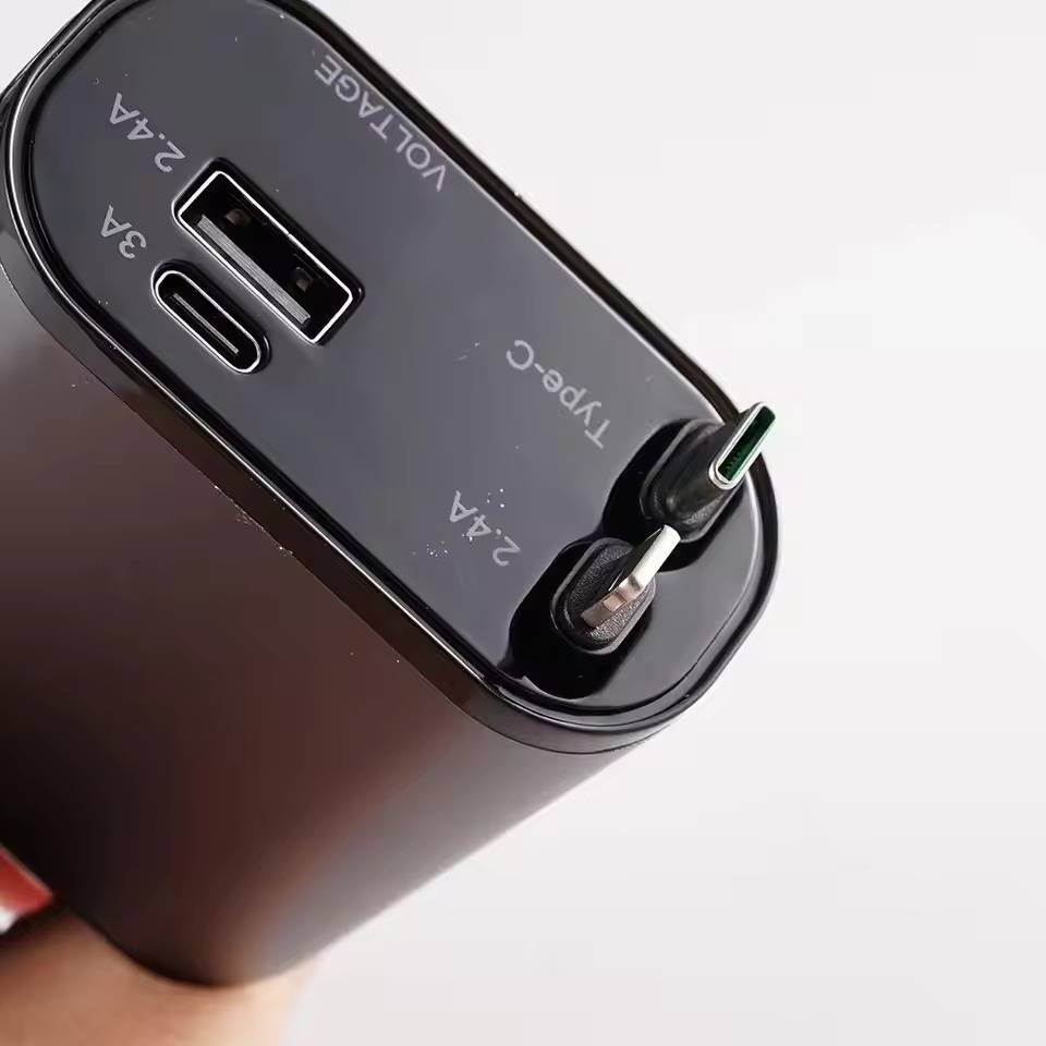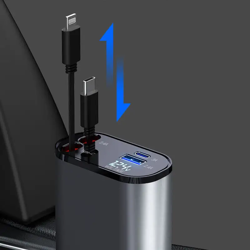 Billaderen lar deg lade opptil fire enheter samtidig. Den har to innebygde kabler og både USB-A- og USB-C-porter. Dette gjør det enkelt å lade telefoner, nettbrett og mer mens du er på farten.