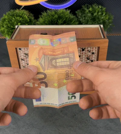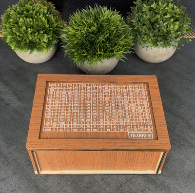 Denne sparebøssen er en vakkert utformet spareboks i tre som gjør sparemålene dine til en praktisk opplevelse. Bare legg inn regningene dine, merk av beløpet og se fremgangen din vokse til du når målet ditt – ingen apper eller konvolutter er nødvendig!