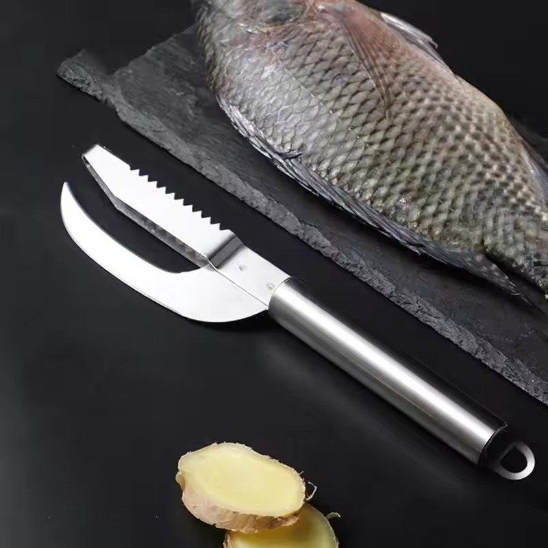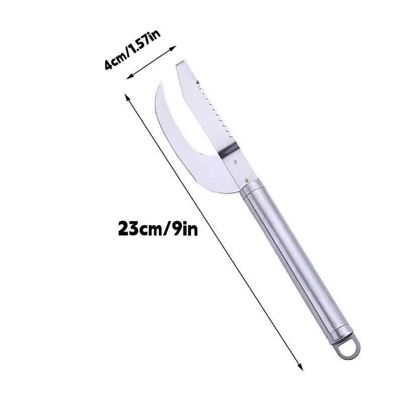 fiskeskjelleren er et 2-i-1-verktøy i rustfritt stål som lar deg skrape, skjære og rense fisk raskt og trygt. Med en skarp, takket kant og ergonomisk håndtak gjør den det enkelt å rense fisk for hjemmekokker, kokker og grillmestere.