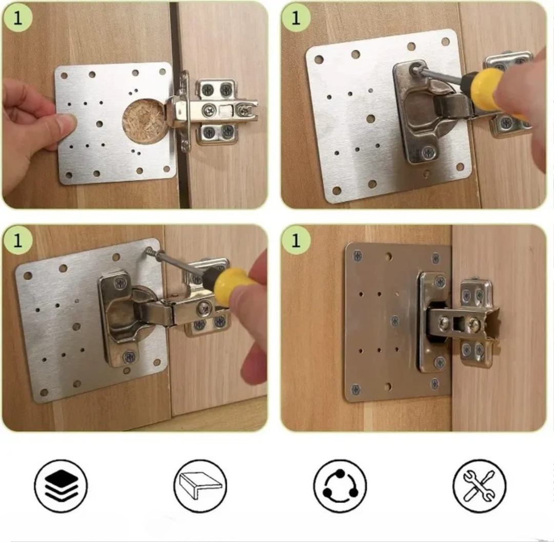 Hengselforsterkningsplaten styrker løse hengsler og dekker skadede treområder rundt skruehullene, slik at skapdørene dine holder seg stabile og sikre. Den gjenoppretter støtten på få minutter og gir møblene dine et rent, ferdig utseende.