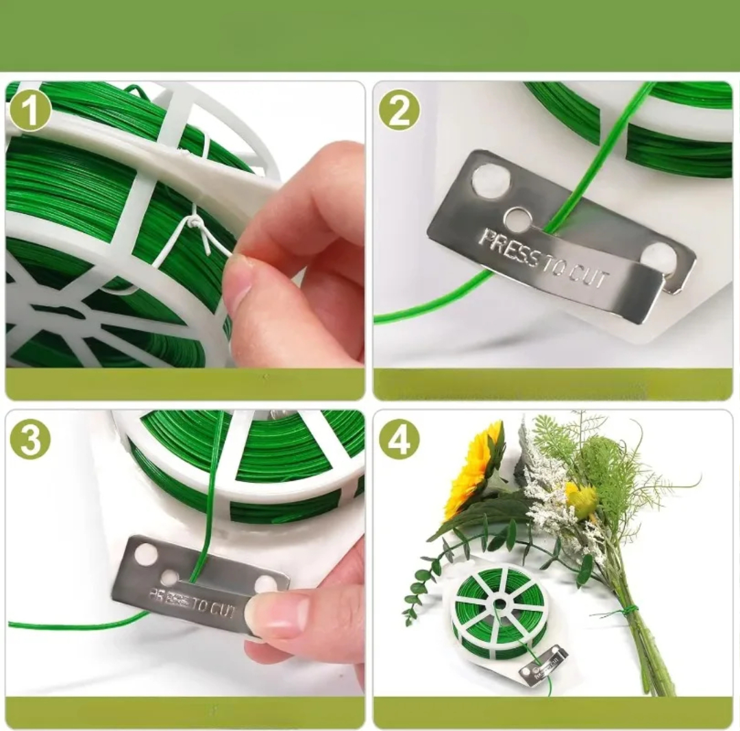 Denne hagesnoren med kutter gjør det raskt og enkelt å støtte planter. Den hjelper deg med å sikre stengler, blomster og klatreplanter uten ekstra verktøy, og holder hagen din ryddig og sunn. Den sterke jerntråden med plastbelegg beskytter plantene samtidig som den holder dem godt på plass. Med den innebygde kutteren kan du klippe nøyaktig den lengden du trenger på få sekunder, noe som sparer tid og krefter.