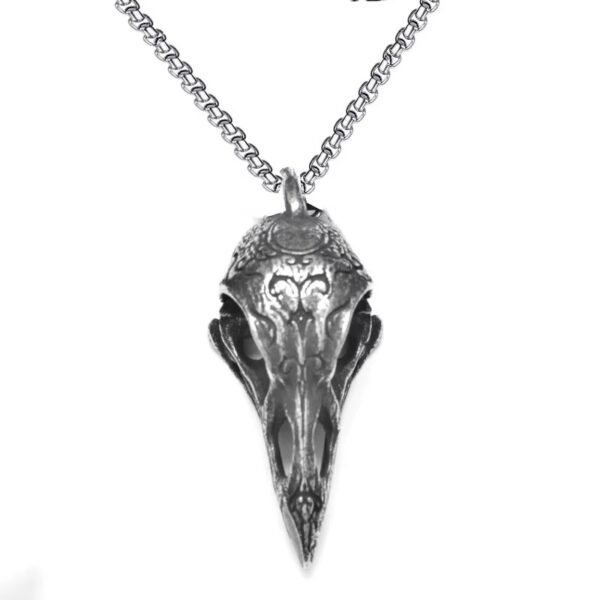 Halsbåndet med ravneskalle har et slående hodeskalleanheng inspirert av gotisk og norrøn stil. Den detaljerte designen gir smykket et mystisk og kraftfullt uttrykk. Perfekt for deg som elsker dristige og edgy smykker.
