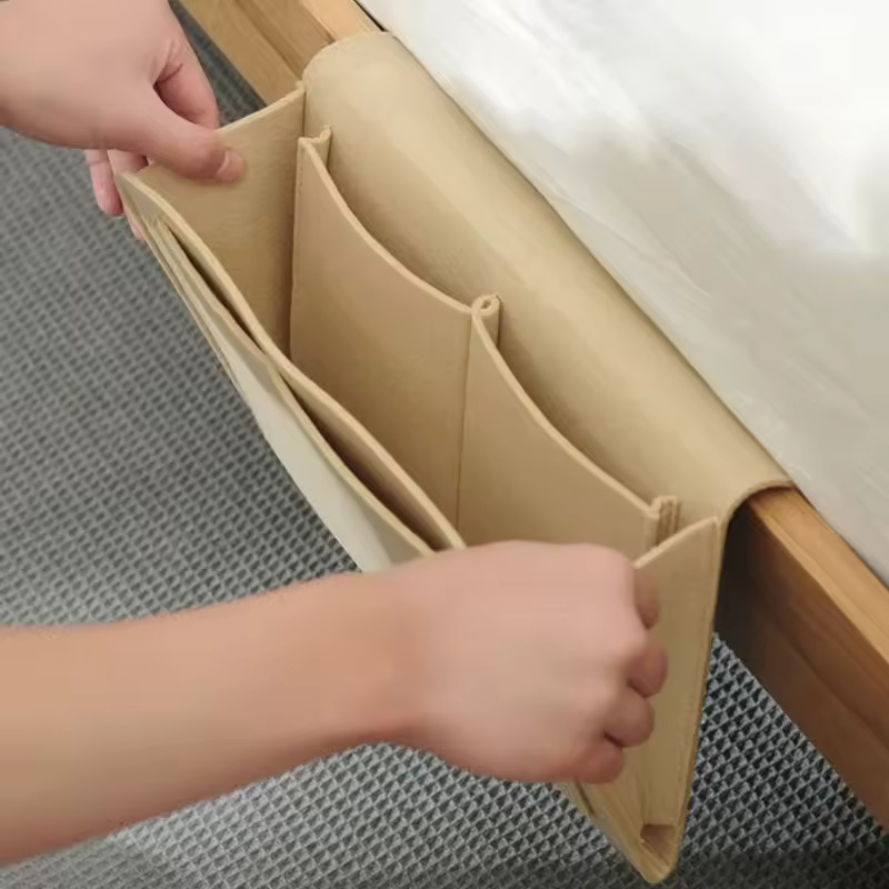Dette hengende oppbevaringspose er en enkel og smart løsning for å redusere rotet rundt sengen, sofaen eller skrivebordet. Den er designet med en bred åpning og robust filtmateriale, og rommer alt fra nettbrett og bøker til fjernkontroller, kabler og nøkler, slik at du aldri mer kaster bort tid på å lete. Den installeres på få sekunder uten verktøy og passer fint inn i ethvert rom.