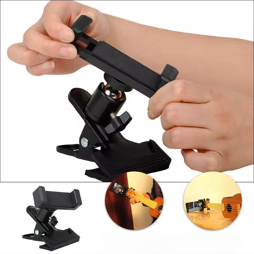 Denne 360° justerbare gitarholderen gir deg en stabil måte å montere gitaren eller instrumentet på, samtidig som du holder telefonen i perfekt synsvinkel. Den er ideell for videoopptak, direktestrømming, leksjoner eller håndfri øving.
