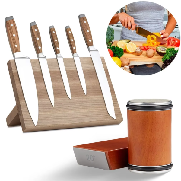 Knivslipersettet gjør det enkelt for alle å slipe kniven. Med sin rullemekanisme er det bare å skyve rullen over bladet, slik at du kan oppnå en skarp egg uten rot, strøm eller vann. Den er designet for å få knivene dine til å bli som nye med minimal innsats.