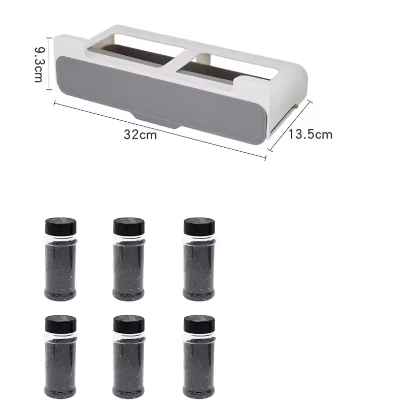 Denne krydderorganisatoren skyves under hyllen for å oppbevare krydder og små kjøkkenartikler på en ryddig måte. Den hjelper deg med å frigjøre plass i skuffer og på benken, samtidig som alt er lett tilgjengelig og godt organisert. En enkel og plassbesparende løsning for et renere og mer organisert kjøkken.