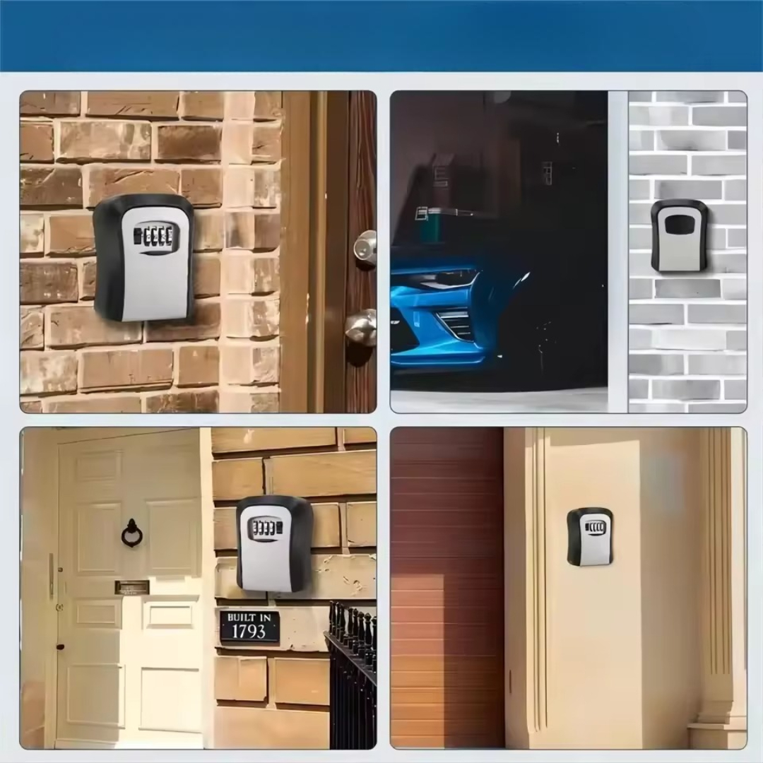 Denne slitesterke nøkkelsafen monteres på en hvilken som helst vegg og holder reservenøklene eller kortene dine trygt skjult bak en tilbakestillbar firesifret kombinasjonskode. Ideell for hjemmebruk, Airbnb, kontor eller utendørs bruk.