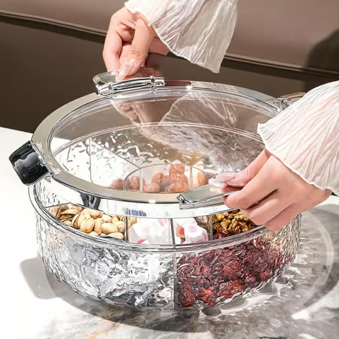 Denne snacksorganisatoren har inndelte rom, sterk forsegling og en stor kapasitet som gjør det enkelt å oppbevare og servere snacks. Den er perfekt for hjemmebruk, fester og utendørsarrangementer, og hjelper deg med å holde alt rent, organisert og klart til å nytes.