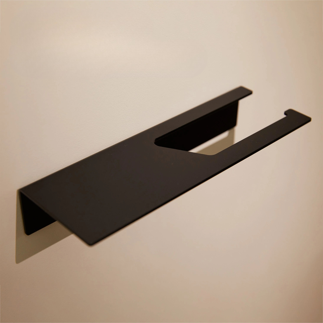 Vi presenterer vår moderne toalettpapirholder med en elegant og minimalistisk design. Den er laget av ett enkelt stykke metall, har en elegant svart finish og tilbyr rikelig med oppbevaringsplass. De CNC-fresede kantene bidrar til det rene og stilige utseendet.
