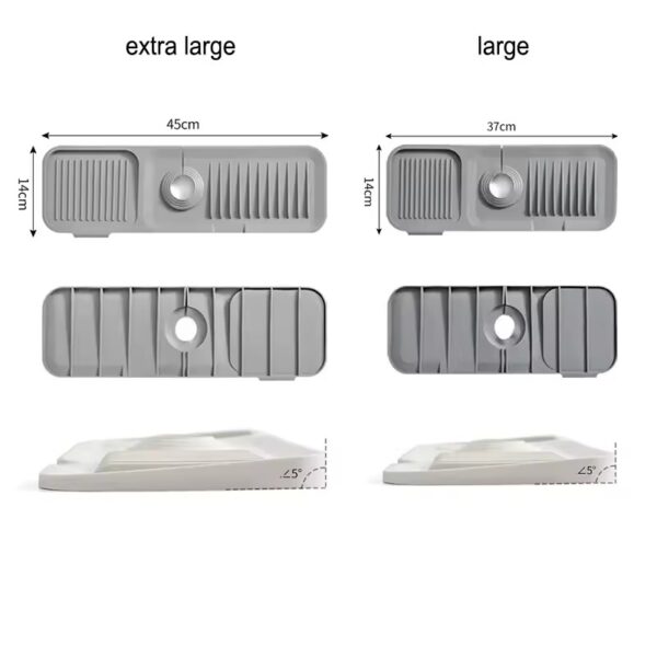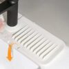 Tørkematten i silikon er utformet med en skrå overflate som leder vannet tilbake i vasken. Dette forhindrer vannansamlinger rundt kranen, og holder benkeplaten ren og tørr. Det er en praktisk løsning for å minimere rotet på kjøkkenet eller badet.