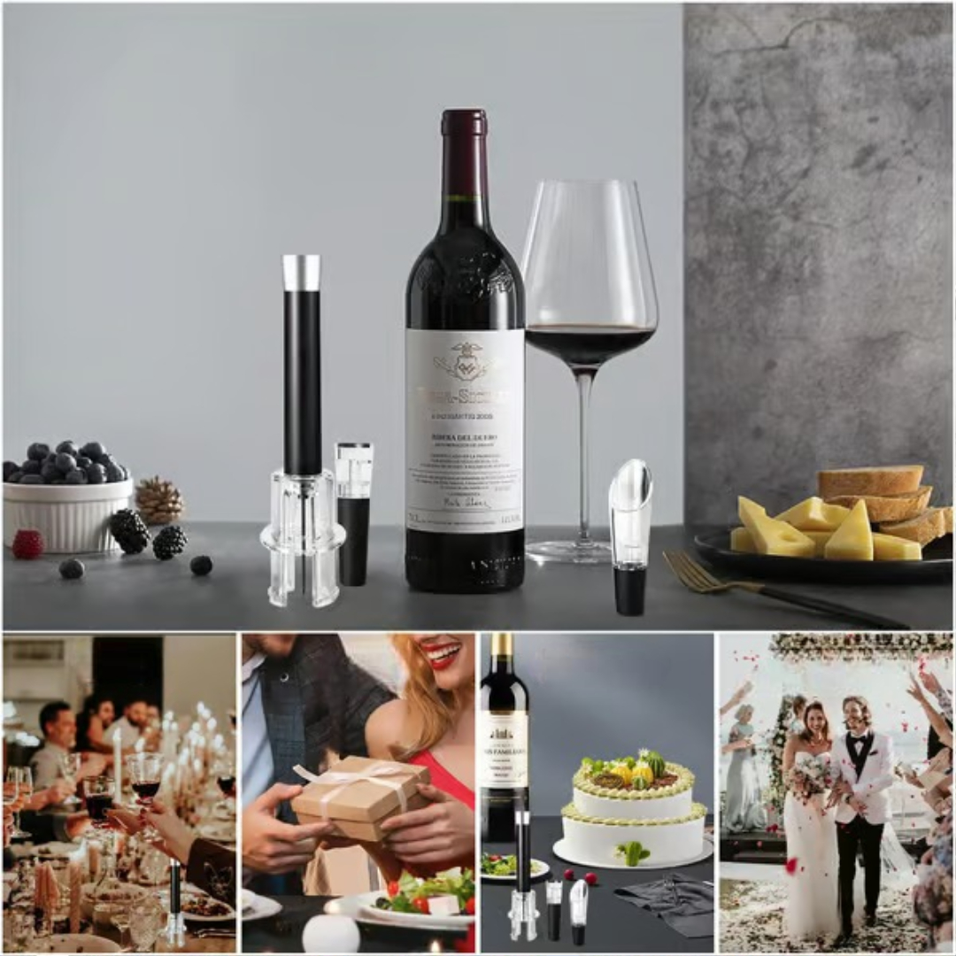 Dette vinåpnersettet bruker lufttrykk for å fjerne korker enkelt – ingen vridning, trekking eller ødelagte korkbiter. Settet inkluderer alt du trenger for en jevn vinopplevelse, enten du åpner en flaske hjemme, er vert for gjester eller gir den perfekte gaven.