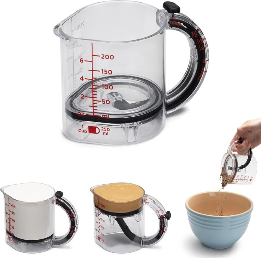 Den här justerbara 4-i-1-mätkoppen ger dig exakt, kladdfri mätning av både våta och torra ingredienser – allt i ett smart, platsbesparande verktyg. Den här justerbara koppen ersätter en hel uppsättning mätkoppar och låter dig växla mellan 250 ml, 125 ml, 83 ml och 62 ml med en enkel glidning. Den täta, inbyggda förseglingen torkar bort kladdiga ingredienser medan du häller, vilket sparar tid och minskar avfallet. Perfekt för bakning, matlagning, måltidsförberedelser och till och med tjocka pålägg som honung eller jordnötssmör.