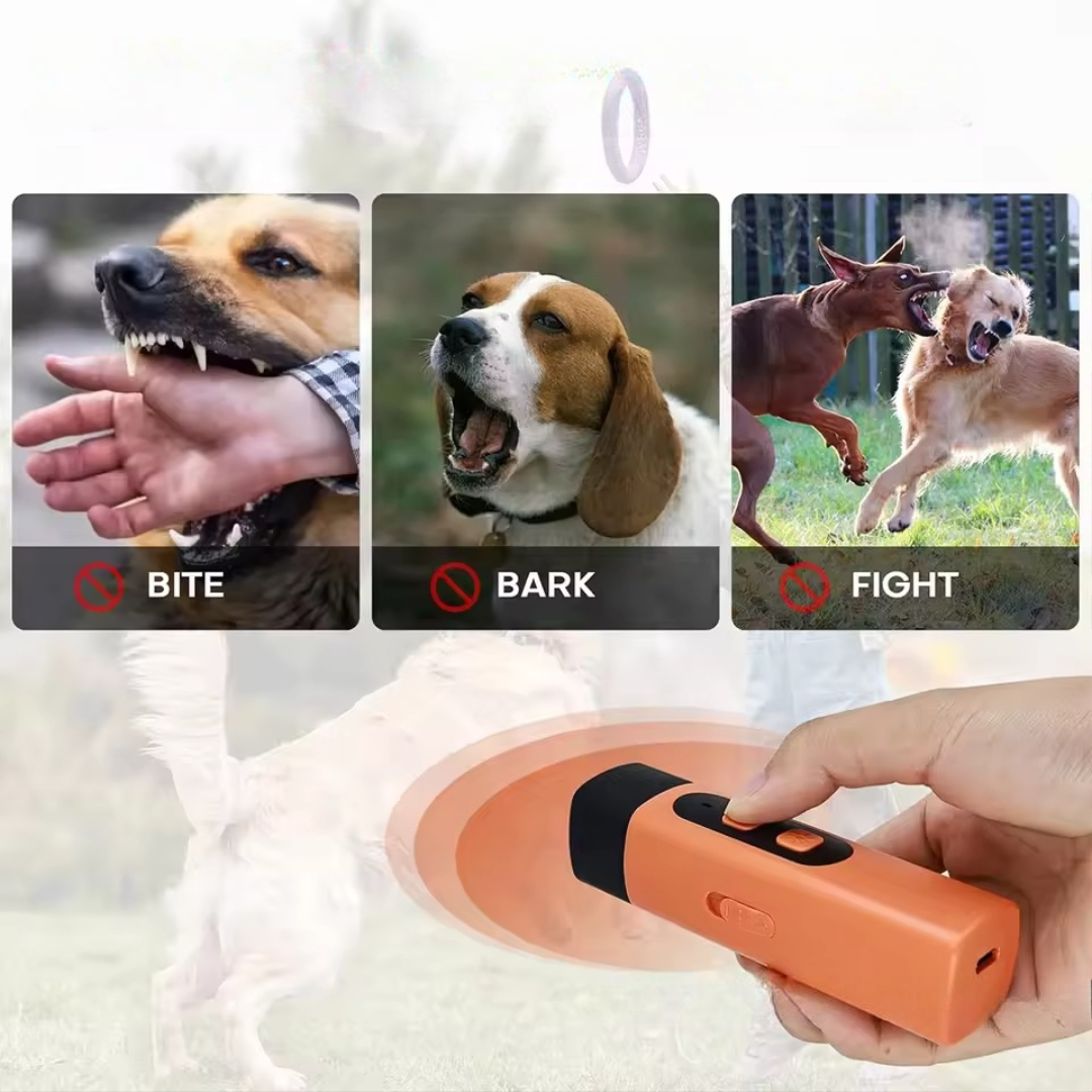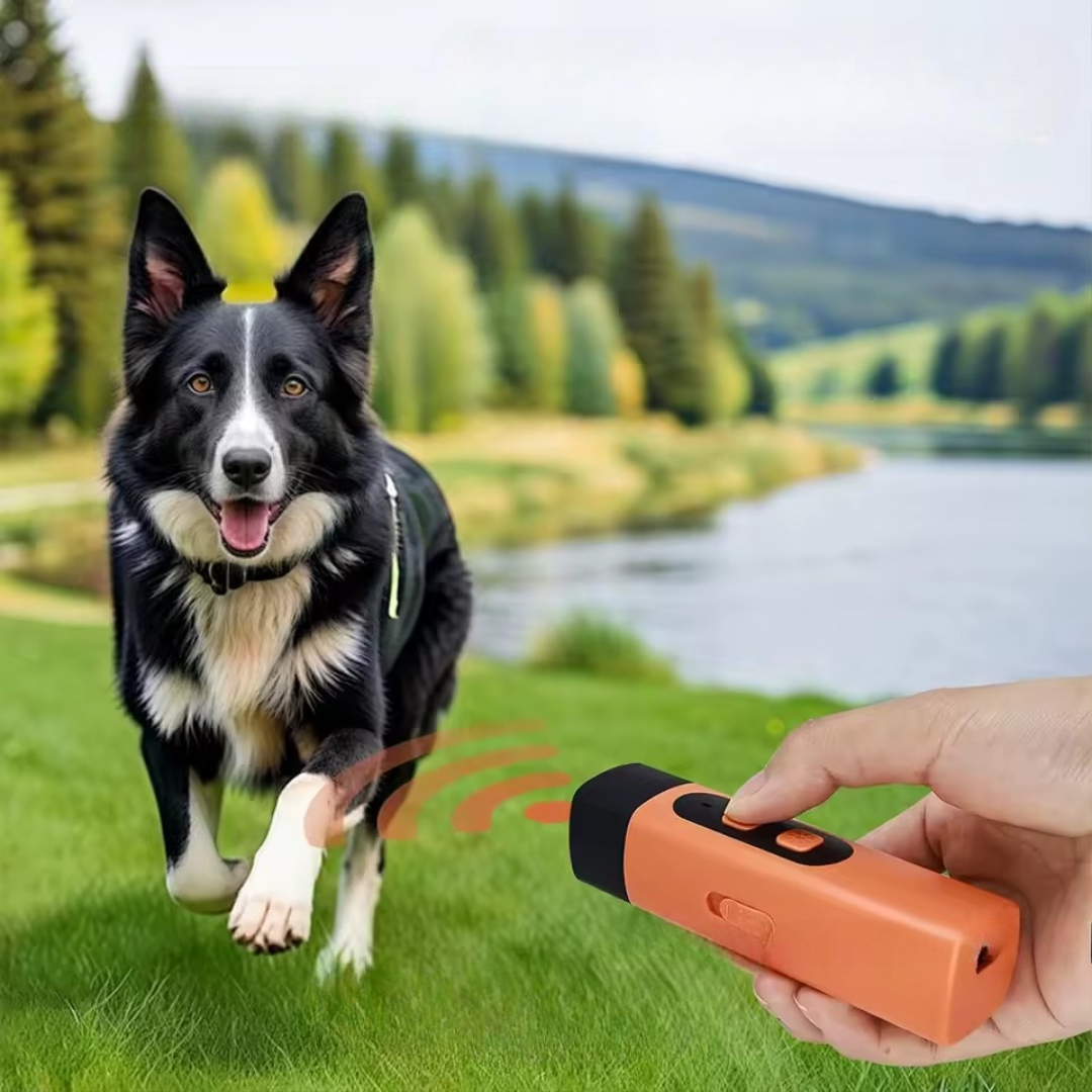 Hundars hörsel är betydligt känsligare än människans. De kan uppfatta dubbelt så många frekvenser som vi – vilket gör att den här enheten kan skicka ut ett milt ultraljud som bara hunden hör. Ljudet är helt ofarligt men tillräckligt irriterande för att avbryta skällandet och skapa uppmärksamhet. 🐶