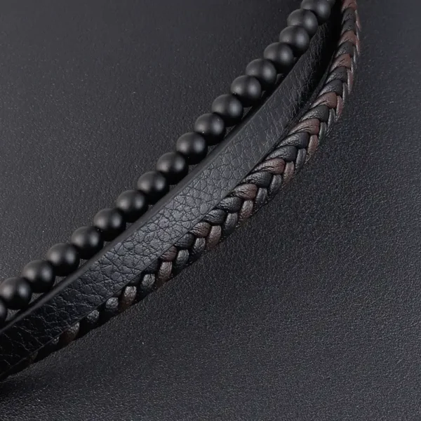 Armbandet i stenläder kombinerar naturstenspärlor med ett snyggt läderband för en djärv och modern look. Dess skiktade design ger djup och karaktär, vilket gör det perfekt för både avslappnade och affärsmässiga outfits. Detta armband är en mångsidig accessoar för alla mäns garderob.
