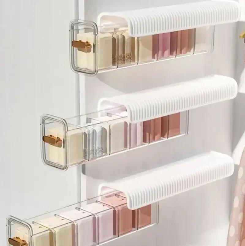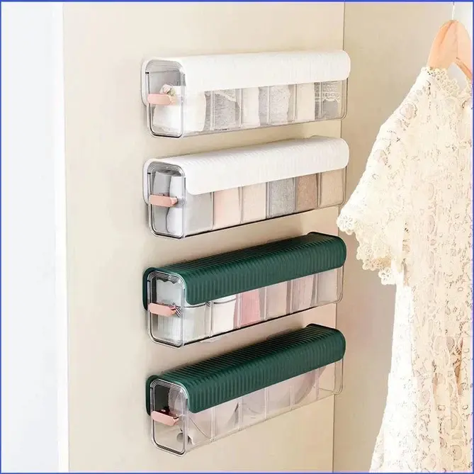 Den här multifunktionella förvaringslådan är perfekt för att hålla dina kläder och andra viktiga saker snygga, rena och lätta att hitta. Dess väggmonterade design sparar utrymme, medan det genomskinliga, dammtäta locket håller allt snyggt och synligt. Med justerbara fack och ett snyggt guldpläterat handtag förenar denna organisatör skönhet med funktionalitet. Perfekt för garderober, badrum, tvättstugor eller andra rum som behöver ordning och reda.