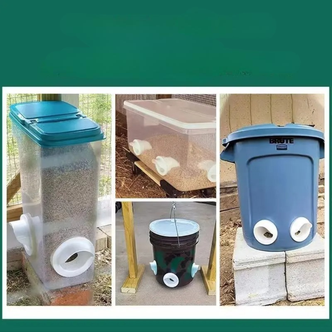 Den här automatiska mataren använder ett gravitationsmatat system för att ge en stadig tillförsel av foder utan ständig påfyllning. Det hjälper till att hålla fodret torrt, minskar röran och säkerställer att dina fjäderfän alltid har tillgång till mat, även när du inte är i närheten. Systemet är utformat som ett DIY-feederportkit och monteras enkelt på en hink eller foderbehållare. Dess regntäta design skyddar fodret från fukt, medan gravitationsflödet levererar rätt mängd mat för att förhindra spill och avfall.