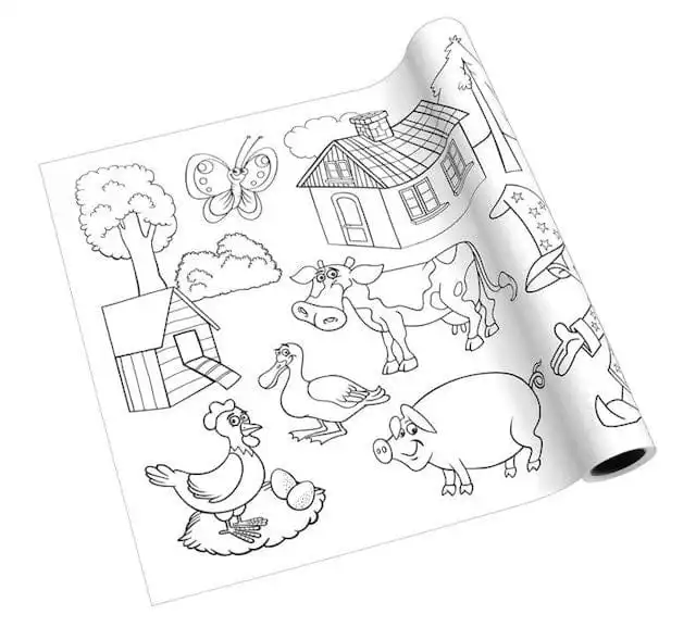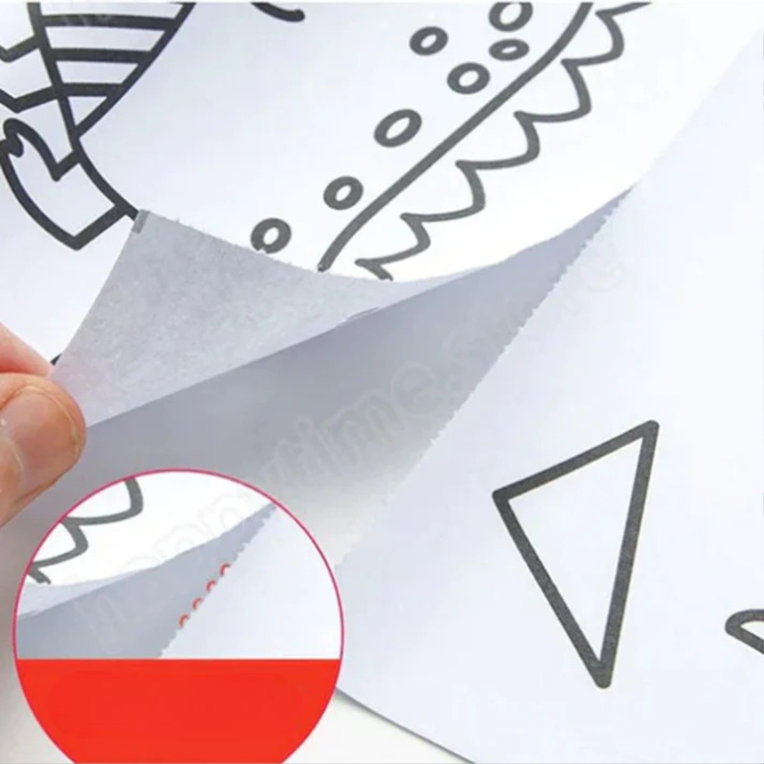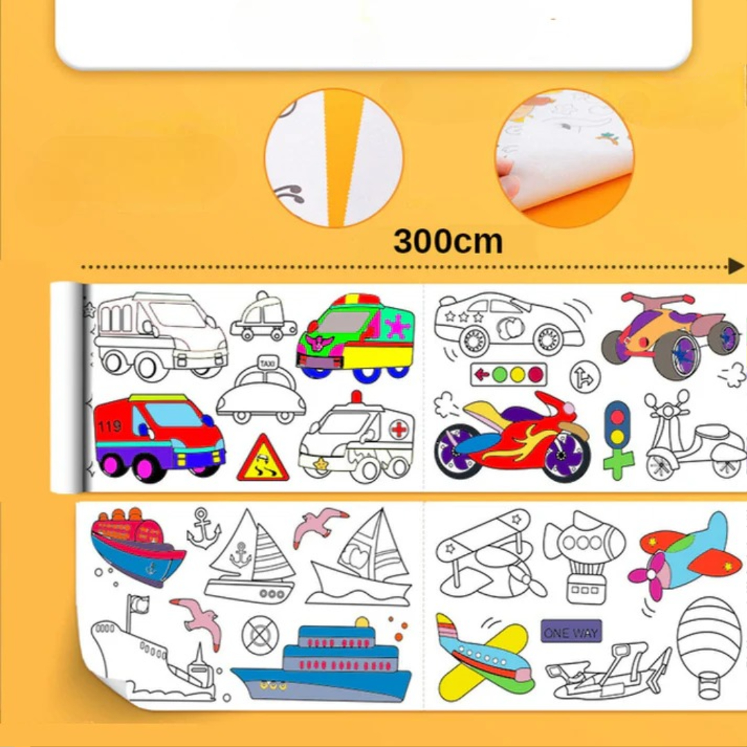 Den här färgrullen förvandlar väggar, golv eller bord till kreativa lekzoner för barn. Bara klistra fast, färglägg och låt fantasin flöda! Med roliga teman som dinosaurier, djur, transporter eller prinsessor håller den små barn engagerade i timmar – inga upprepningar, ingen tristess.