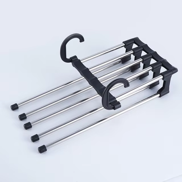 Med sin unika 5-i-1-design erbjuder detta byxställ flexibla upphängningsalternativ. Du kan välja att hänga den horisontellt eller vertikalt beroende på ditt utrymme, så att du enkelt kan anpassa hur du organiserar dina byxor.