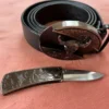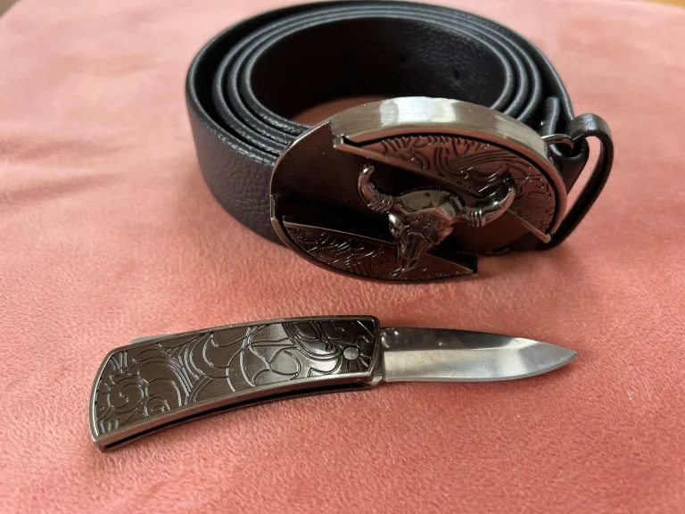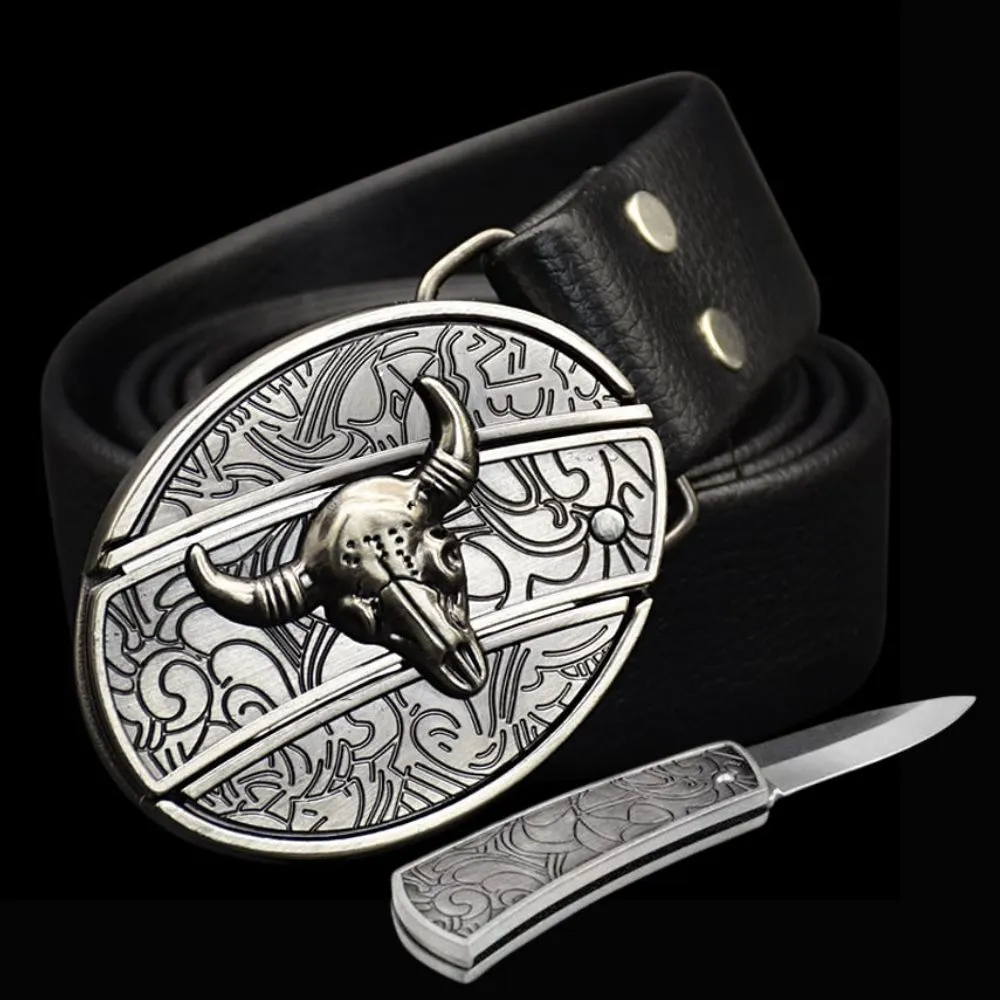 Att ha en kniv till hands kan vara användbart, särskilt ute i naturen. Vårt snygga bältesspänne innehåller en dold kniv, så att du alltid är beredd på överraskningar. Det robusta bladet håller sig vasst under lång tid. Det här bältet är tillverkat av äkta läder och är tåligt och kan hantera väder och vind och dagligt slitage. Oavsett om det är för vardagsbruk eller utomhusäventyr är det här bältet den perfekta följeslagaren!