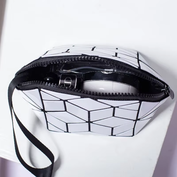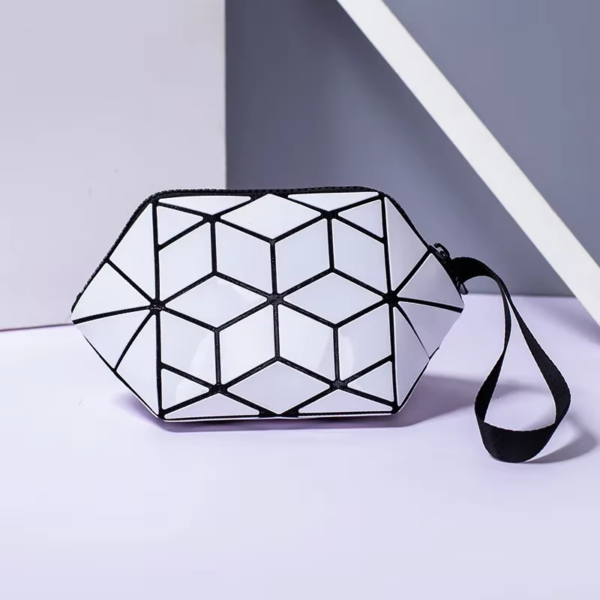 Kosmetikväskan har ett geometriskt självlysande mönster som ändrar färg i olika ljus, vilket skapar ett snyggt och iögonfallande utseende. Denna moderna design gör den perfekt för alla tillfällen, oavsett om du reser eller organiserar din makeup hemma. Den kombinerar praktiska egenskaper med mode för att passa dina dagliga behov.