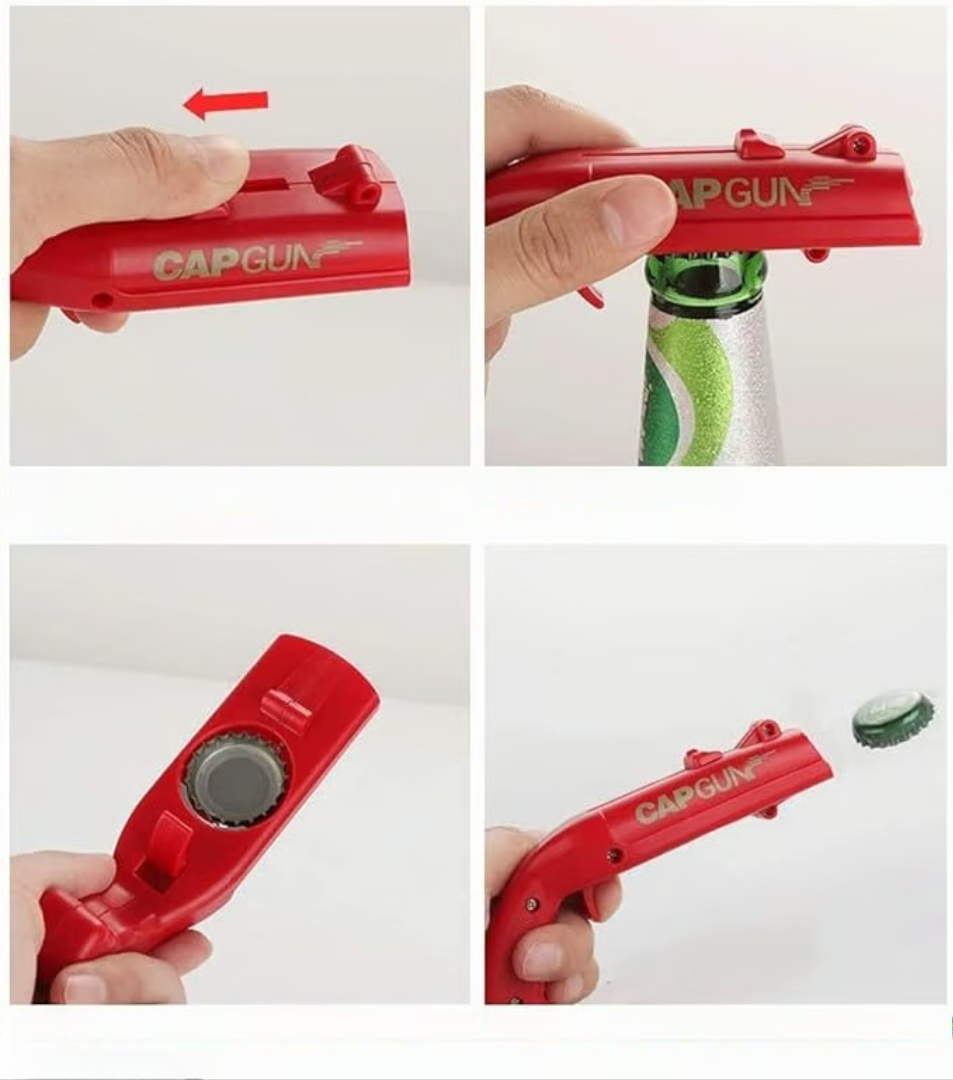 Tillverkad av starkt ABS-material öppnar den här flasköppnaren flaskor rent utan spill, och avfyraren skjuter kapsyler upp till 5 meter för en unik drinkspelstwist. Lätt, bärbar och säker att använda, det är ett enkelt sätt att imponera på gästerna och öka feststämningen vart du än går.