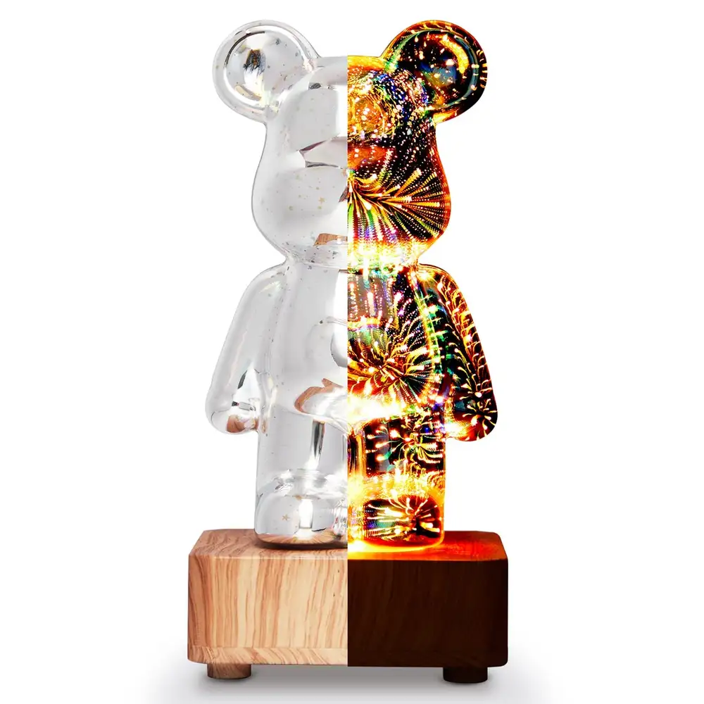 Skapa en drömsk, varm atmosfär med denna bedårande björnformade 3D-fyrverkeri nattlampa – perfekt för både barn och vuxna. Denna LED-björnlampa har en fantastisk tredimensionell fyrverkerieffekt som lyser i livfulla färger, vilket ger charm och komfort till alla rum. Den är designad med en träbas och en miljövänlig glasskärm, den är USB-driven och enkel att använda, vilket gör den till ett fantastiskt dekorativt föremål eller en hjärtlig gåva för alla tillfällen.