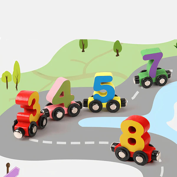 Ställ de numrerade tågvagnarna i ordning eller blanda dem för kreativ lek.