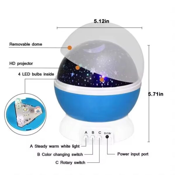 Stjärnprojektorns nattlampa skapar en fascinerande stjärnhimmel direkt i ditt rum. När locket är öppet fyller stjärnljuset hela utrymmet och skapar en lugnande atmosfär. Denna vackra projektion förvandlar alla sovrum till en magisk plats, perfekt för barn att känna sig trygga och avslappnade på natten.