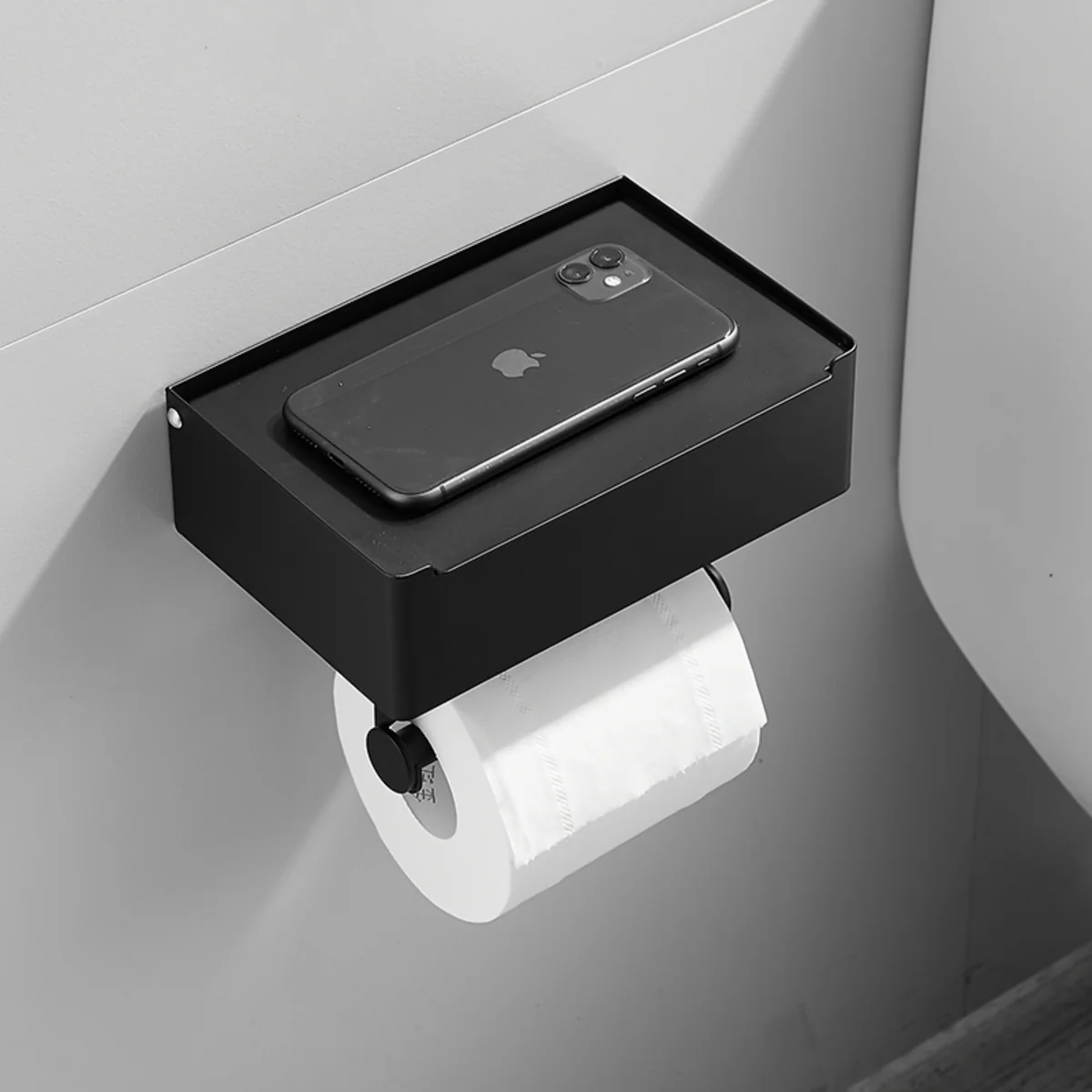 Den här toalettpappershållaren blandar minimalistisk design med vardaglig funktionalitet. Den är tillverkad av rostfritt stål med en elegant mattsvart finish och är mer än bara en toalettpappershållare – det är en smart och elegant förvaringslösning.