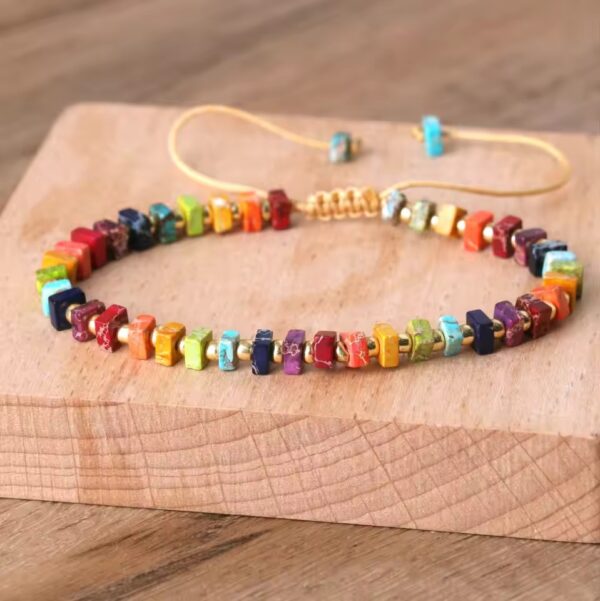 The chakra stone bracelet features a beautiful square shape made from natural imperial stones. Each bracelet is handmade, giving it a unique charm that complements any outfit. Its elegant design is perfect for both casual and formal occasions.
