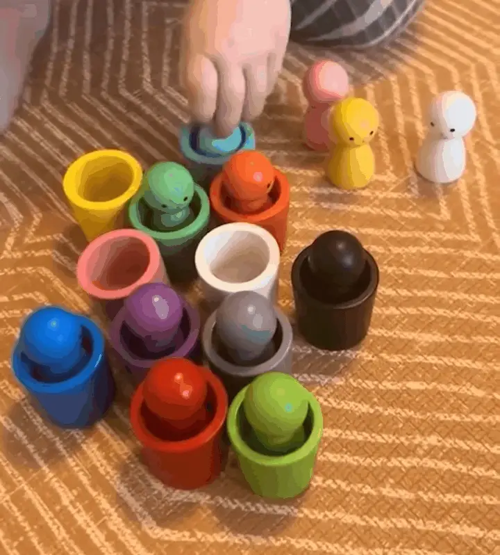 These color sorting cups are a Montessori-style learning toy designed to build early cognitive and motor skills. Children match colorful wooden dolls with the correct cups, improving color recognition, hand-eye coordination, and logical thinking while playing safely and independently or with parents. A colorful, safe, and educational toy that grows with your child’s curiosity and skills.