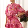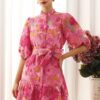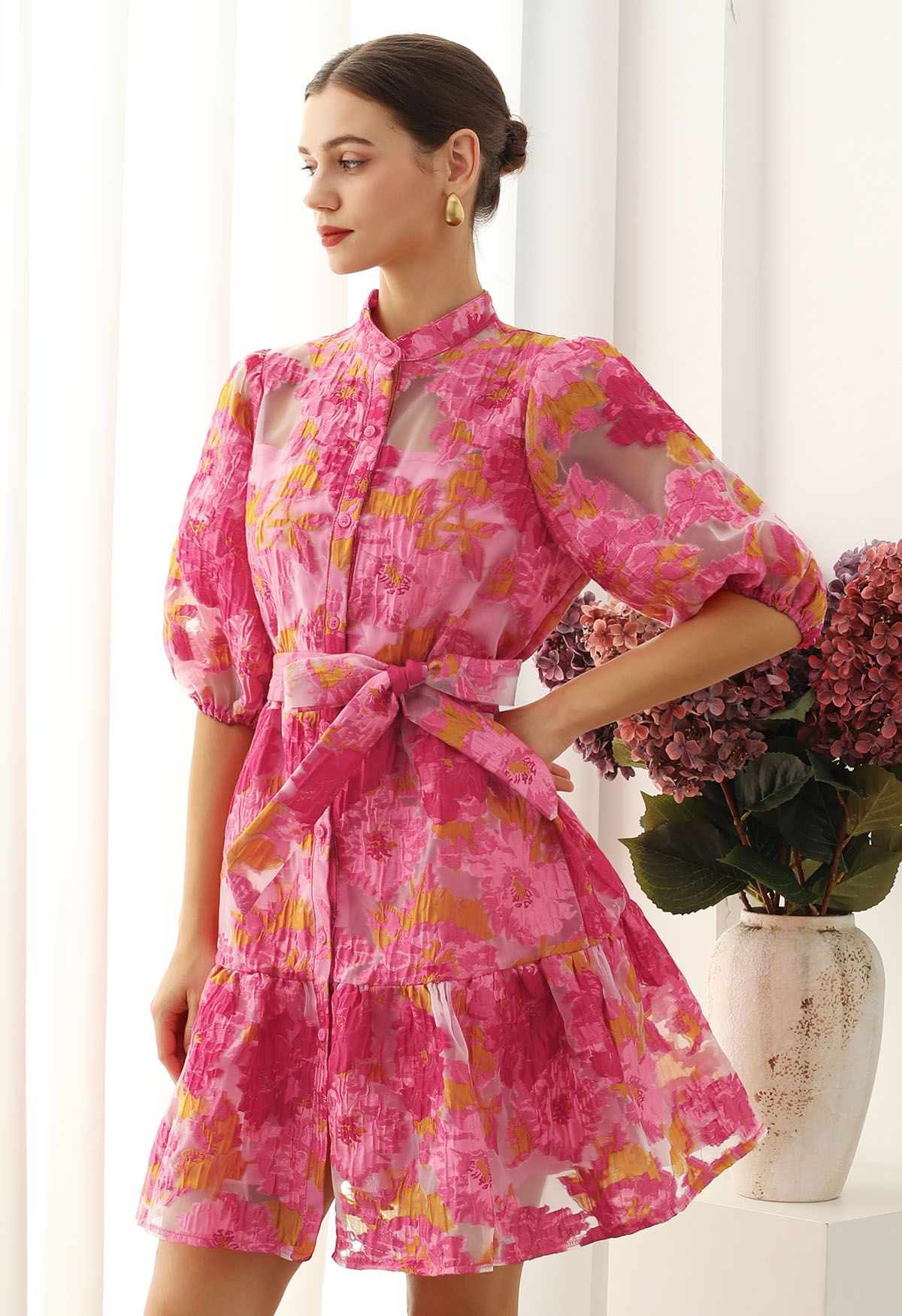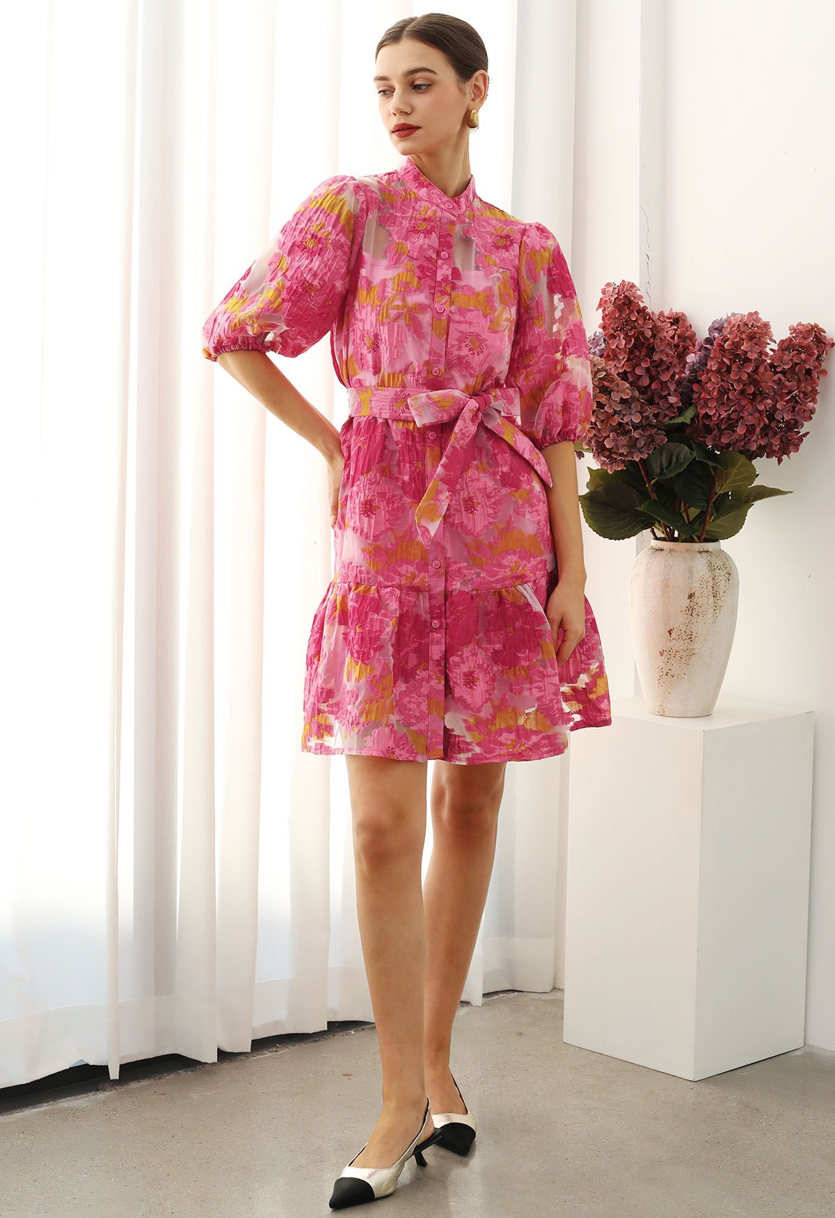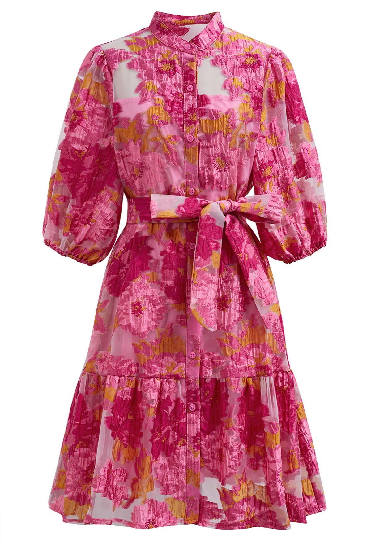 Exuding vintage charm, the floral jacquard puff sleeves organza buttoned belted dolly dress is a statement piece. Featuring delicate floral jacquard fabric and puff sleeves, it brings a whimsical, feminine feel. The buttoned front and self-tie bowknot at waist add structure, while the overall design radiates playful elegance, making this dress an ideal choice for special occasions or stylish daywear.