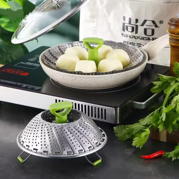 The foldable steamer basket expands from 5.1 inches to 9 inches, making it perfect for different pots and pans. It opens like a flower and folds compactly for easy storage. A simple way to turn any pot into a steamer.