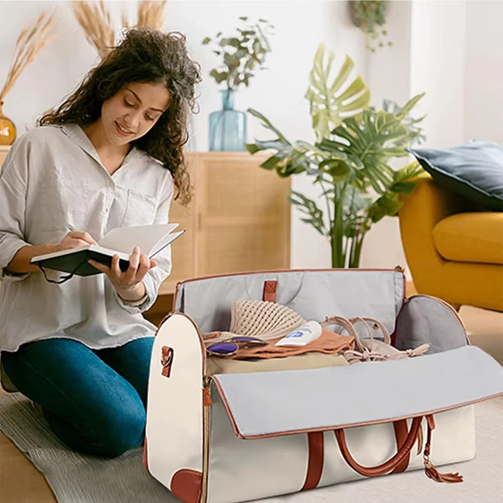 The foldable travel bag easily transforms from a spacious duffel bag to a protective garment holder. This innovative design allows you to carry clothes without worrying about wrinkles or damage, making it ideal for both business and leisure trips.