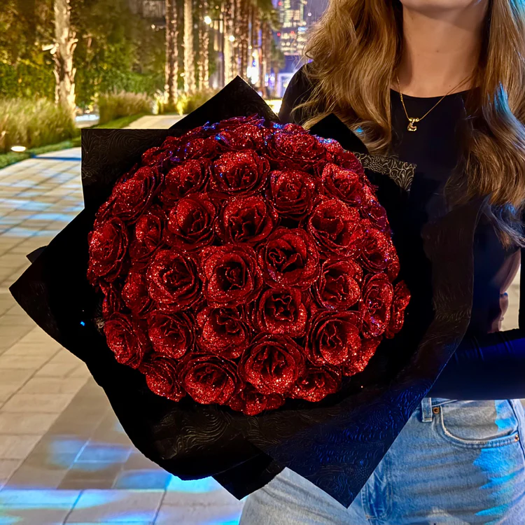 This radiant bouquet features handcrafted roses coated in a dazzling glitter finish, wrapped in luxurious materials. Whether itâs for anniversaries, proposals, Valentineâs Day, or âjust because,â this bouquet makes a bold statement of love and elegance.