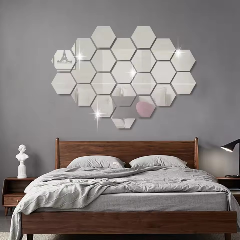 Hexagon wall stickers add a modern and stylish look to any space. Their mirror-like finish reflects light beautifully, creating a brighter and more inviting atmosphere. Perfect for enhancing your living room, bedroom, or bathroom decor.