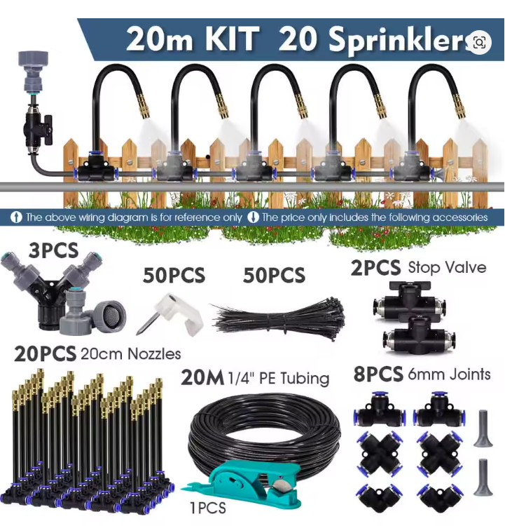 You get 20 meters of main hose, 20 sprinklers, nozzles, connectors, shut-off valves, and a clipper to adjust the hose length. This kit is your best gardening partner! Design your own setup, save time and water, and help your plants grow beautifully.