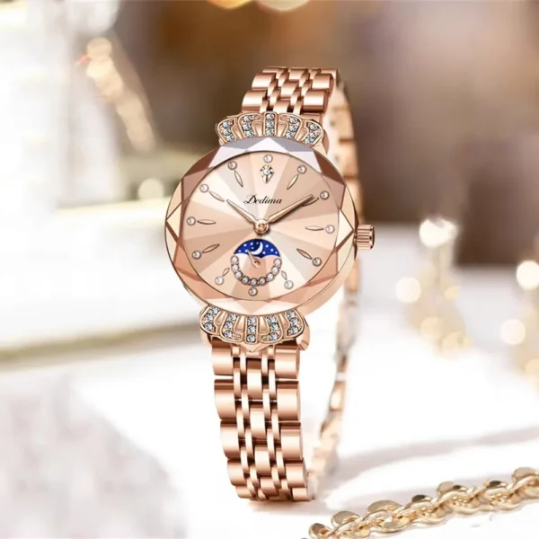 The luxury diamond watch combines style and sophistication with its sparkling diamond accents. Perfect for special occasions or everyday wear, this watch adds a touch of glamour to any outfit. Its refined details make it a standout accessory for women who value elegance.