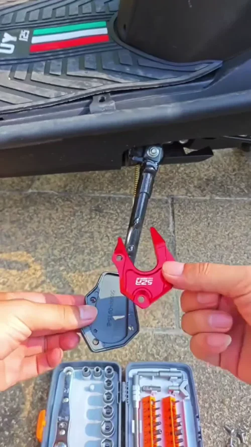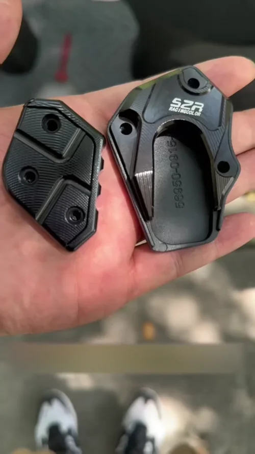 This motorcycle side extension support increases the contact area of your side stand, giving your bike better stability on soft or uneven ground. It helps prevent sinking, slipping, and accidental falls when parked on mud, grass, sand, or hot asphalt. Made from high-strength CNC-machined aluminum, this side stand enlarger installs easily without drilling or modifications. Its anodized finish resists wear and weather, making it a reliable upgrade for everyday riding and touring.