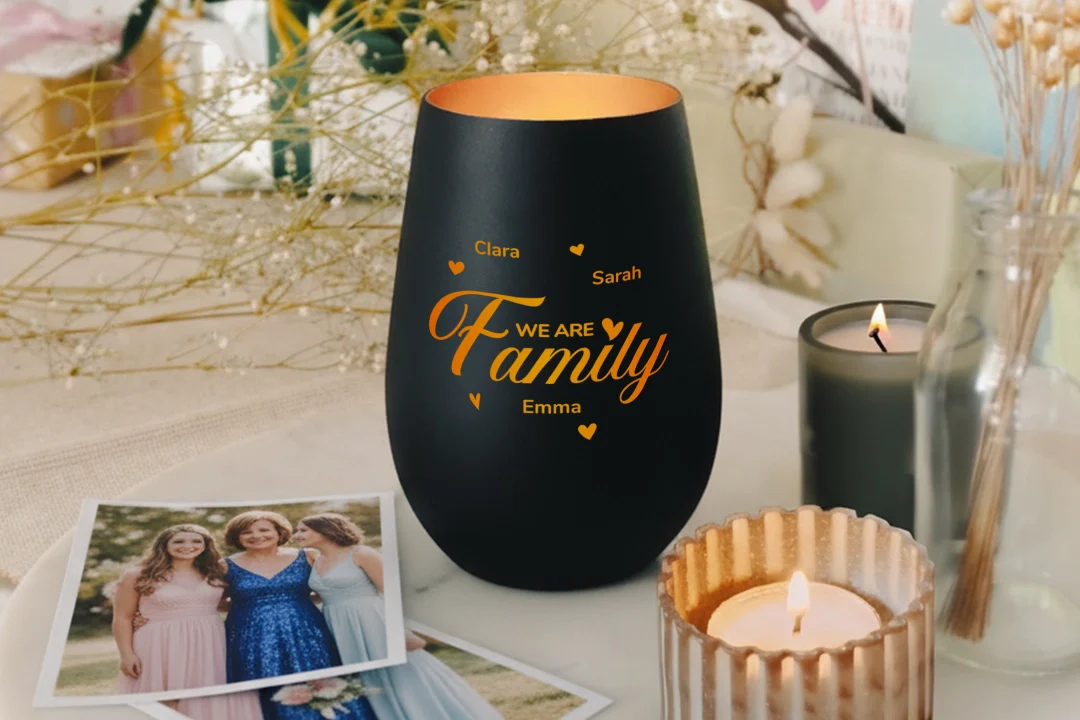 For Christmas, a birthday or a little thank you note, this personalized candle holder brings a warm touch to the home and highlights the first names that are dear to you.